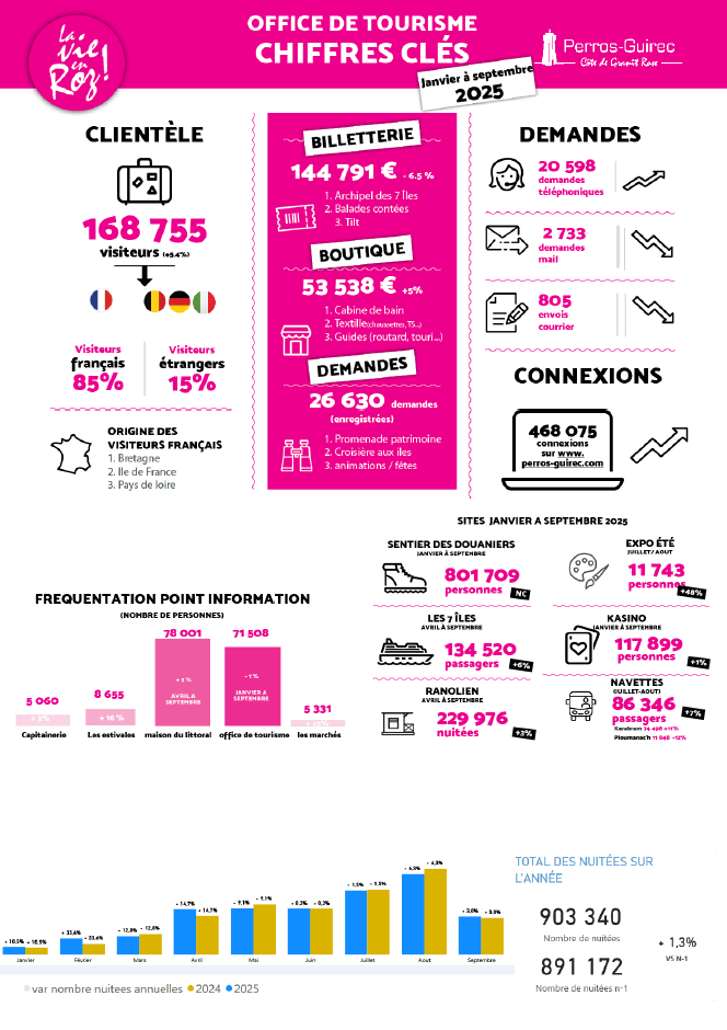 En 2024, l’Office de Tourisme de Perros-Guirec a accueilli près de 80 000 visiteurs, confirmant une fréquentation toujours aussi forte.