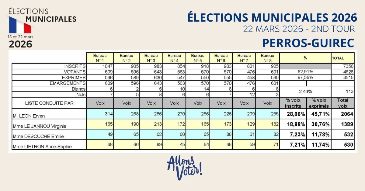 Le second tour des élections municipales s’est déroulé le dimanche 22 mars 2026. À Perros-Guirec, ce ne sont pas moins de 4628 personnes qui se sont déplacées jusqu’aux urnes.