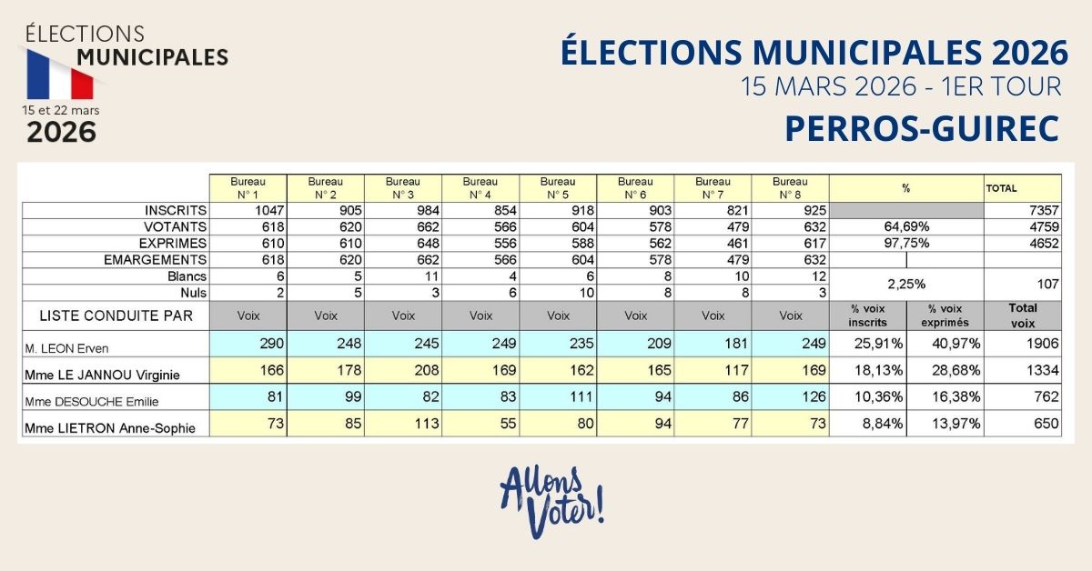 Le premier tour des élections municipales s’est déroulé le dimanche 15 mars 2026. À Perros-Guirec, ce ne sont pas moins de 4759 personnes qui se sont déplacées jusqu’aux urnes.